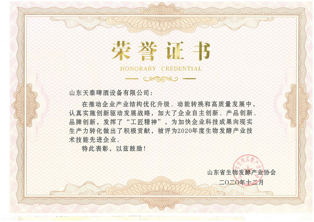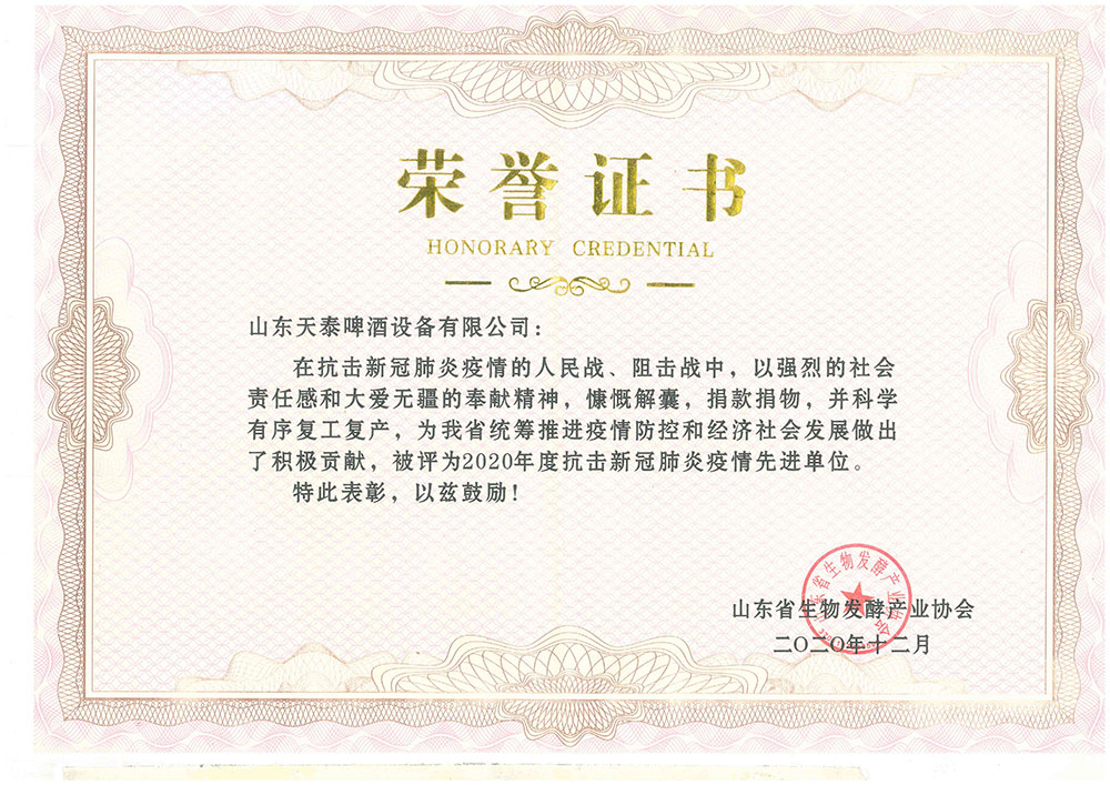 大會表彰了“山東省生物發(fā)酵產業(yè)協會抗擊新冠肺炎疫情先進單位”、“生物發(fā)酵產業(yè)技術技能先進企業(yè)和先進個人”。山東天泰啤酒設備有限公司被授予“抗擊新冠肺炎疫情先進單位”和“生物發(fā)酵產業(yè)技術技能先進企業(yè)”榮譽稱號。